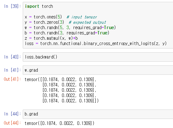 그리고 다음 loss.backward()를 사용하여 각 매개변수의 도함수를 계산합니다.
