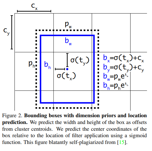 YOLO v2에서는 예측한 bounding box \(t\)값 \(t_x, t_y, t_w, t_h\)를 구하고, 적절한 수식을 통해 \(b\)값 \(b_x, b_y, b_w, b_h\)으로 변경한 후 L2 Loss를 통해 학습시켰습니다. 하지만 YOLO v3는 다음 공식을 거쳐 \(t_*\)로 변형시킨 후 \(t_x\)와 Loss계산을 통해 학습 시키는 방식을 선택합니다.
