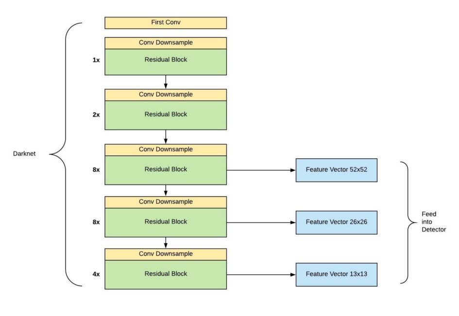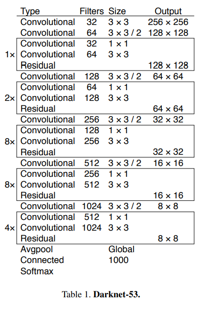 YOLO v3에서는 shortcut connection이 추가되어 53개의 layer를 가지는 Darknet-53을 backbone network로 사용합니다.