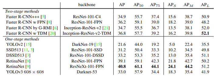 위 표는 다양한 IoU threshold와 다양한 사이즈의 물체에 대한 성능을 비교한 표 입니다.