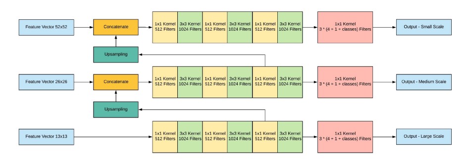 이 때 각 scale에 해당하는 feature map의 output channel 수가 (3 x (4 + 1 + 80) = 255)가 되도록 마지막 1x1 Conv Layer의 channel 수를 조정합니다. 여기서 3은 각 gride cell이 예측하는 anchor box의 수를, 4는 bounding box offset, 1은 objectness score, 80은 COCO 데이터셋의 클래스 수 입니다. 즉, 최종적으로 52x52x255, 26x26x255, 13x13x255 크기의 feature map을 얻을 수 있습니다.