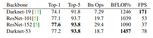 Darknet-53은 Darknet-19보다 더 높은 성능을 내며, ResNet-152와는 비슷한 성능에서 2배 이상의 빠르기를, ResNet-101보다는 높은 성능과 더 빠른속도를 내는 모습을 확인할 수 있습니다.