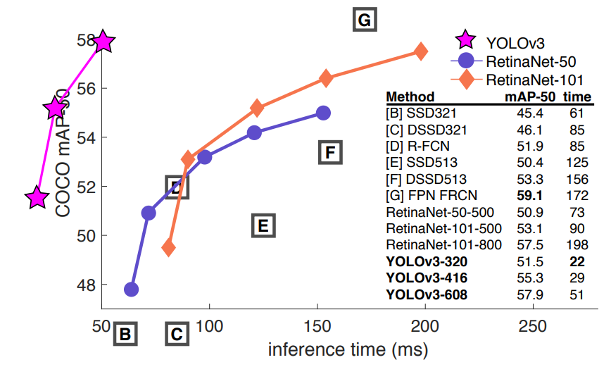 YOLO v3는 RetinaNet에 비해서는 다소 낮은 성능을 보이고, SSD와 성능이 비슷하지만 3배 이상 빠른 속도를 보였습니다. 위의 그래프에서 볼 수 있듯이 inference 속도 면에서 혁신적인 성과를 보였습니다.