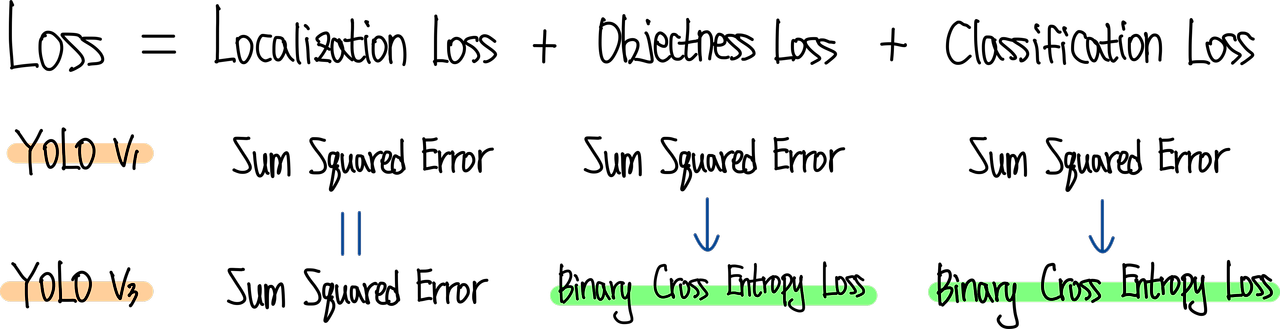 위 그림은 YOLO v1과 YOLO v3의 Loss의 상세 구성을 비교한 그림입니다. YOLO v3에서는 Objectness Loss와 Classification Loss는 Binary Corss Entropy Loss를 사용했습니다.
