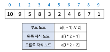 - 부모 노드의 키 값이 자식 노드의 키 값보다 크거나 같은 완전 이진 트리