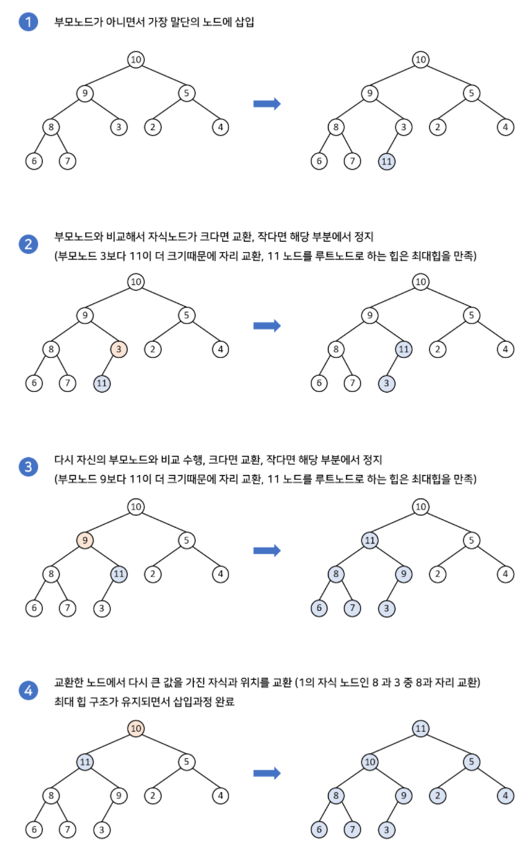 이러한 경우, 최대힙의 조건을 만족할 수 있게 노드들의 위치를 바꿔가며 힙을 재구조화 해주어야 합니다.